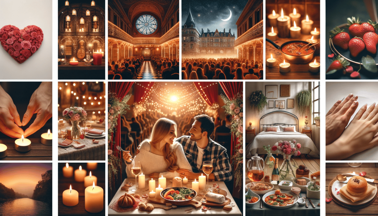 V - A picture of a romantic dinner setup with candles and roses